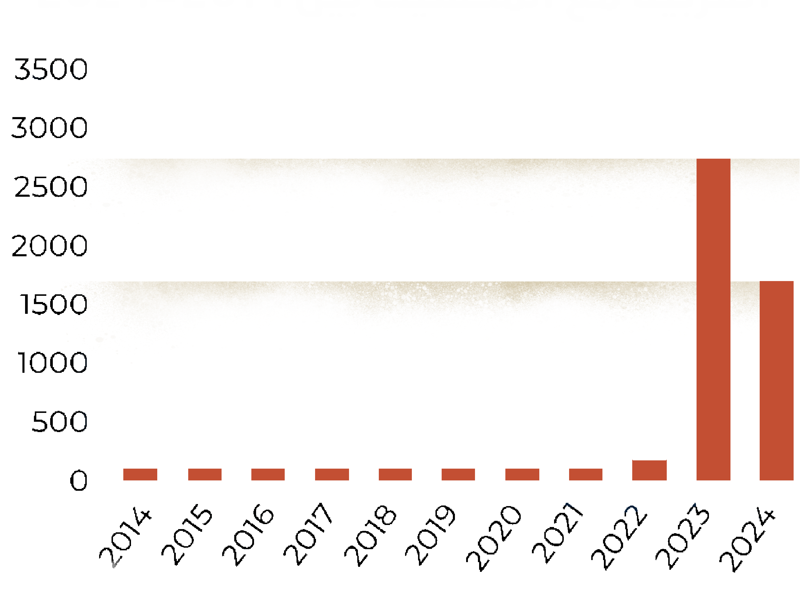 عدد المصريين الموقوفين من قبل سلطات الحدود الأميركية عند الحدود البرية الجنوبة الغربية مع المكسيك 2014-2024