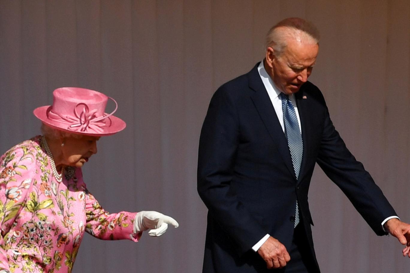 وحضرت الملكة مرتدية ثوباً مزيناً بالورود وقبعة زهرية بصحبة جو بايدن وزوجته جيل عرضاً لحرس الشرف بزيّهم الأحمر التقليدي، معتمرين قبعة من شعر الدب الأسود في فناء القصر الذي تقيم فيه منذ بداية الوباء. وبعد أن استمعوا إلى عزف النشيدين الوطنيين البريطاني والأميركي تحت أشعة الشمس، دخلوا لاحتساء الشاي قبل أن يغادر بايدن إلى بروكسل، حيث من المقرر أن يشارك الاثنين في قمة الحلف الأطلسي.