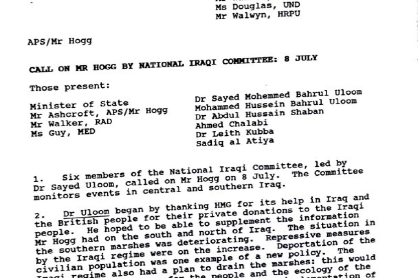 تؤكد وثيقة بريطانية أن وزير الدولة للشؤون الخارجية دوغلاس هوغ، استقبل في الثامن من يوليو (تموز) 1992 ستة أشخاص من أعضاء في اللجنة الوطنية العراقية لحماية الوسط والجنوب، وهم محمد بحر العلوم، ومحمد حسين بحر العلوم، وعبدالحسين شعبان، وأحمد الجلبي، وليث كبة، وصادق العطية. وكما ورد في التقرير فإن هوغ أكد على أن الحكومة البريطانية تعتقد أن التغيير في العراق يجب أن يأتي من الداخل العراقي، ولا يمكن فرضه من الخارج.