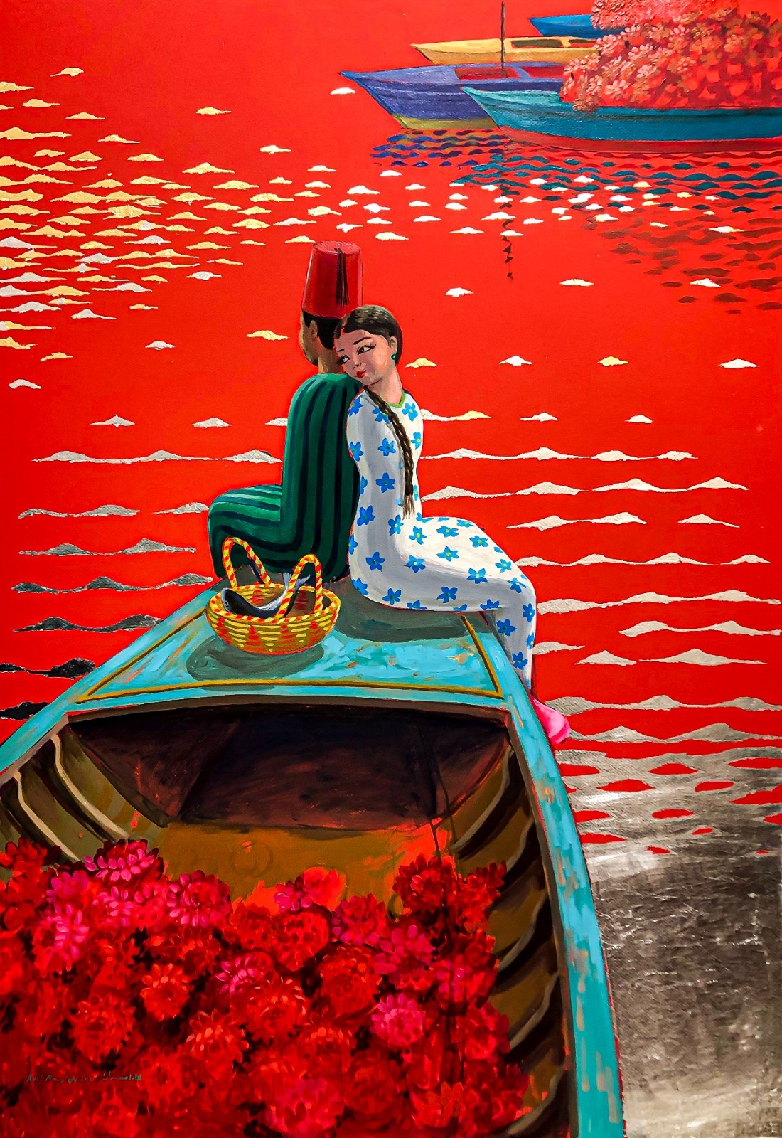 العالم الذي يشكله الفنان في لوحاته، عالم متخيل كما قلنا، وأكثر ما يشدك إلى هذا العالم هو اللون. فثمة رغبة في تأكيد قوة اللون وكثافته عبر توظيف الدرجات اللونية الصريحة التي تبدو كما لو أنها قد خرجت مباشرة من أنبوب الرسم. عنصر آخر يتكرر في الأعمال إلى جانب الدمية الروسية (باتريوشكا)، هو الزهور، التي يساهم حضورها في تأكيد هذا الألق اللوني. الزهور هنا حاضرة في جميع اللوحات بأشكال وصيغ مختلفة. فباقات الزهور الكبيرة تملأ المراكب وتزين ملابس العاشقين، كما تمتلىء بها شباك الصيادين. هو واقع خيالي ورومانسي بالطبع؛ واقع تتحرك في رحابه الشخصيات في ثنائيات: رجل وامرأة، مستمتعين جميعاً بهذه الأجواء الخيالية ومستأنسين بمشهد البحر الفضي.