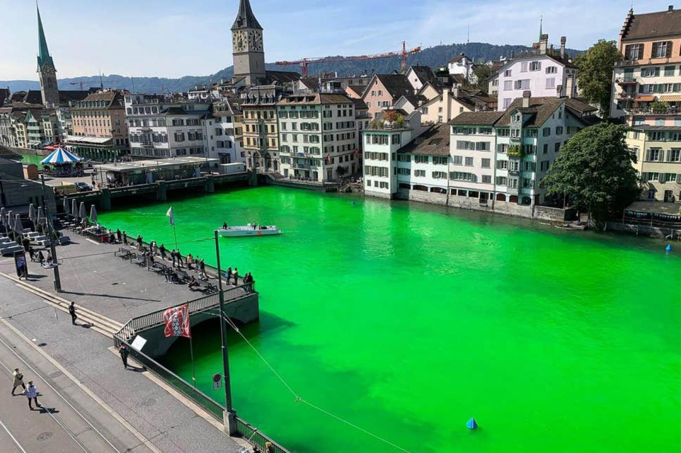 صُبغ نهر يتدفّق عبر مدينة زيوريخ باللون الأخضر المضيء على يد مناهضي التغيّر المناخ.
