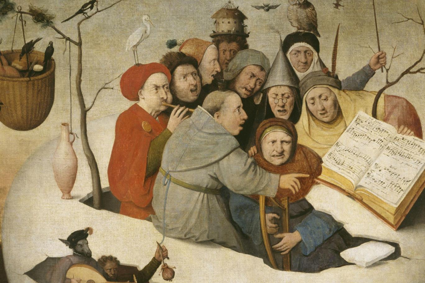 شهد القرن الخامس عشر توسعاً هائلاً في شخصية المجنون، المرتبطة بالمهرجانات الكرنفالية والفولكلور، أصبحت شخصيته منتشرة في كل مكان، كما يظهر في فن بيتر بروغل الأكبر الذي يصبح فيه المجنون شاهداً على جنون البشر. سيكون عصر النهضة هو العصر الذهبي للحمقى. في قاعة نابليون المستديرة التي تم تجديدها في متحف اللوفر، يستحوذ المجانين على مشاهد الرقص وسواها من الموضوعات التي جسدها الفنانون على جميع الأنواع: من أكثر الأشياء اليومية إلى الأثمن (مشغولات ذهبية وعلى الطين والخشب والنسيج). يستحضر المعرض الرسام هيرونيموس بوش الذي تتميز أعماله بالغرابة والغموض، من خلال لوحة "سفينة الحمقى" عام 1500، وهي مستوحاة من كتاب ألماني، يحمل العنوان نفسه، نشر في نهاية القرن الخامس عشر، ومزود برسوم توضيحية عبارة عن نقوش على الحجر. حقق في حينه نجاحاً باهراً فكان الأكثر مبيعاً بعد الكتاب المقدس، وكان له تأثير قوي على الثقافة وخصوصاً على الفنون البصرية من خلال نقوشه التي ثبتت صورة الرجل المجنون بقبعته ذات آذان الحمير وأقراص الديك، وأجراسه، وهو يحمل بإحدى يديه نظارات وباليد الأخرى عصا يعلوها رأس بشع على شاكلته. المجنون يسلي ويبهر منذ لحظة دخوله إلى المشهد. هذه المقولة تتبدى من خلال لوحة نموذجية (بريشة الفنان فرانز فيربيك) تمثل هذه شخصية الهذيانية بلباس المهرج وهو ينظر من خلال أصابعه بطريقة غريبة مع ابتسامة طافحة على الوجه.
