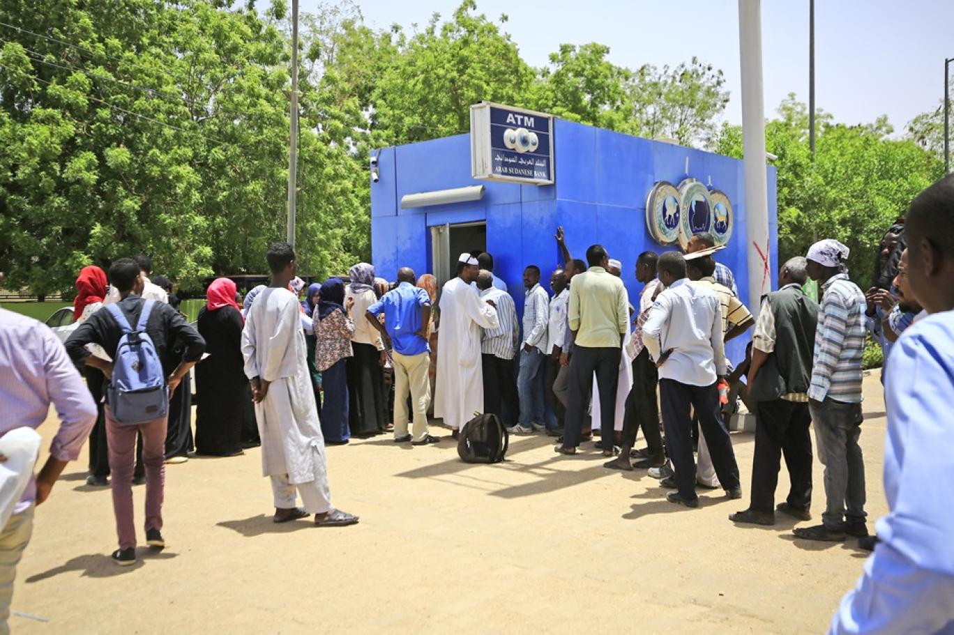 سودانيون يصطفون أمام أحد أجهزة الصراف الآلي لسحب أموالهم في الخرطوم (أ ف ب)